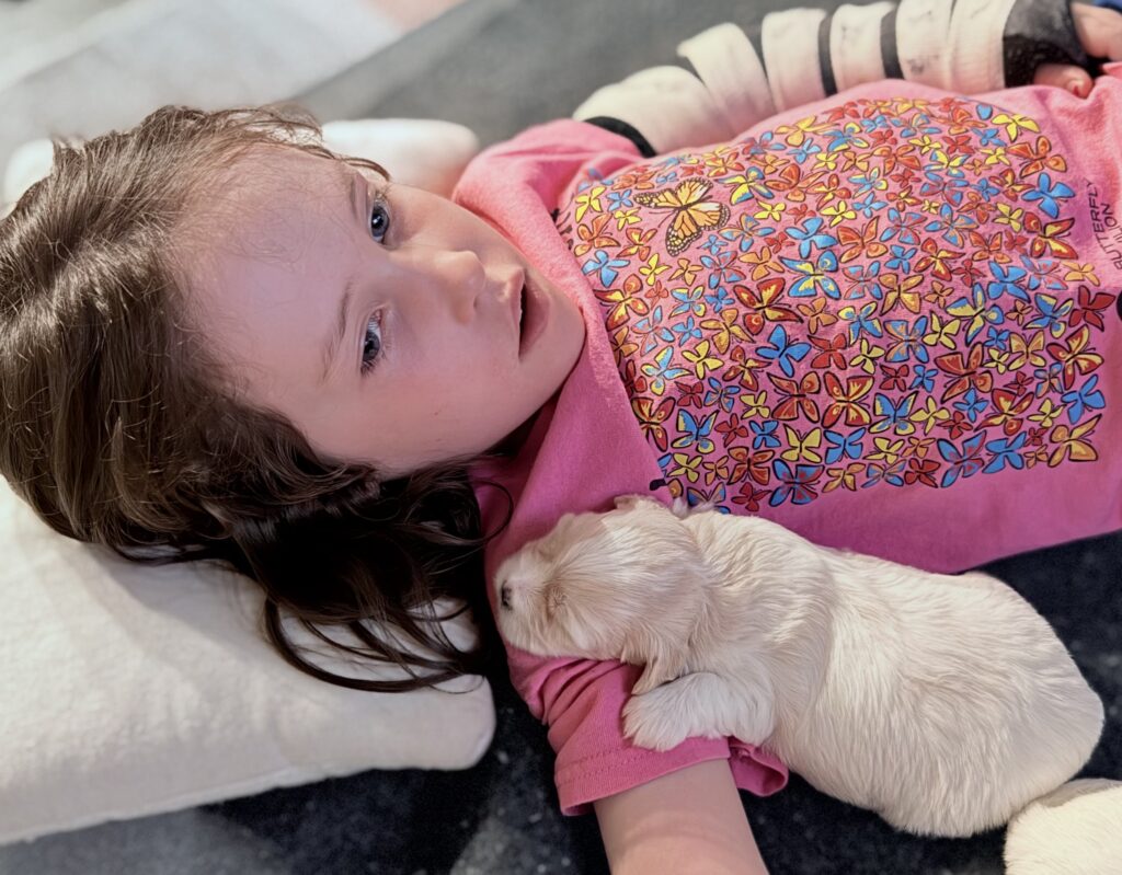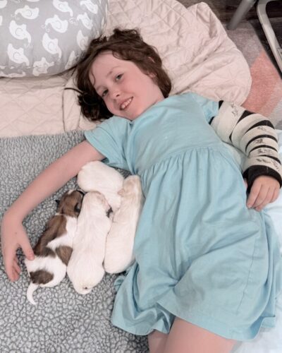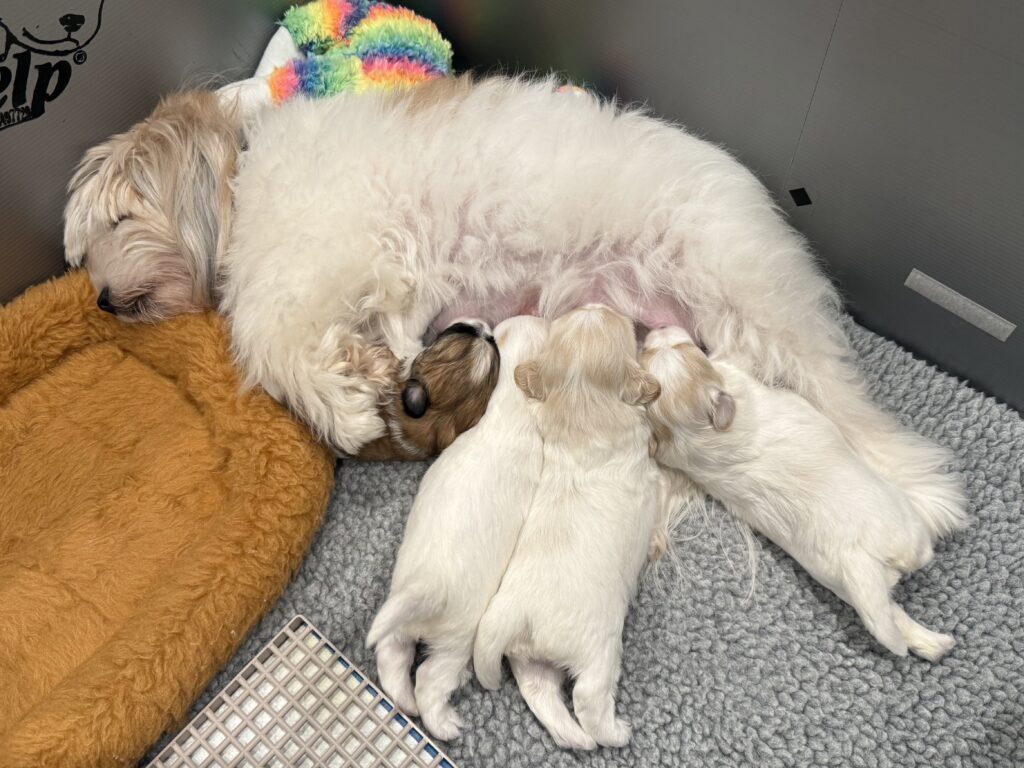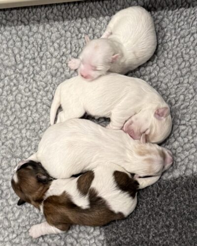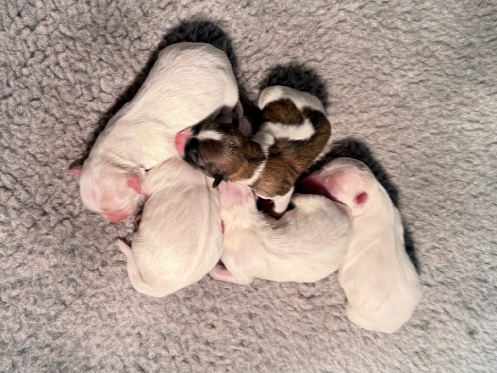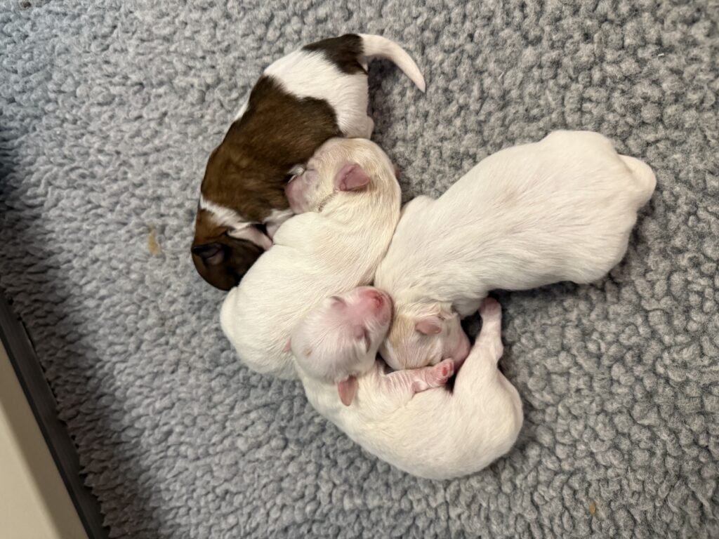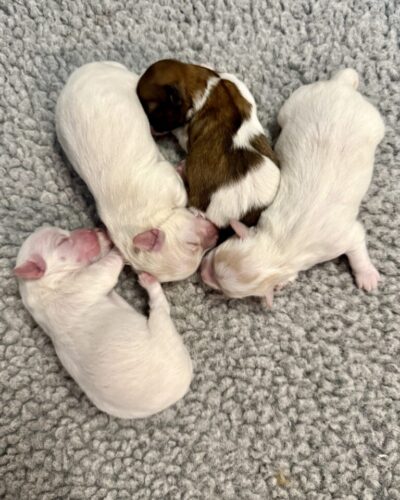 Dottie whelped 5 beautiful puppies between 1230-130am…4 girls and 1 boy! Everything initially seemed well and Dottie nursed all without hesitation. We were devastated when one of the girls started to struggle. She went downhill quickly and it quickly became apparent that the most humane thing to do was let her pass peacefully in our arms. This is the first puppy in 44 that we have lost and we’re still reeling. We will introduce the litter soon.