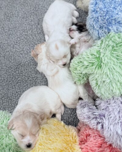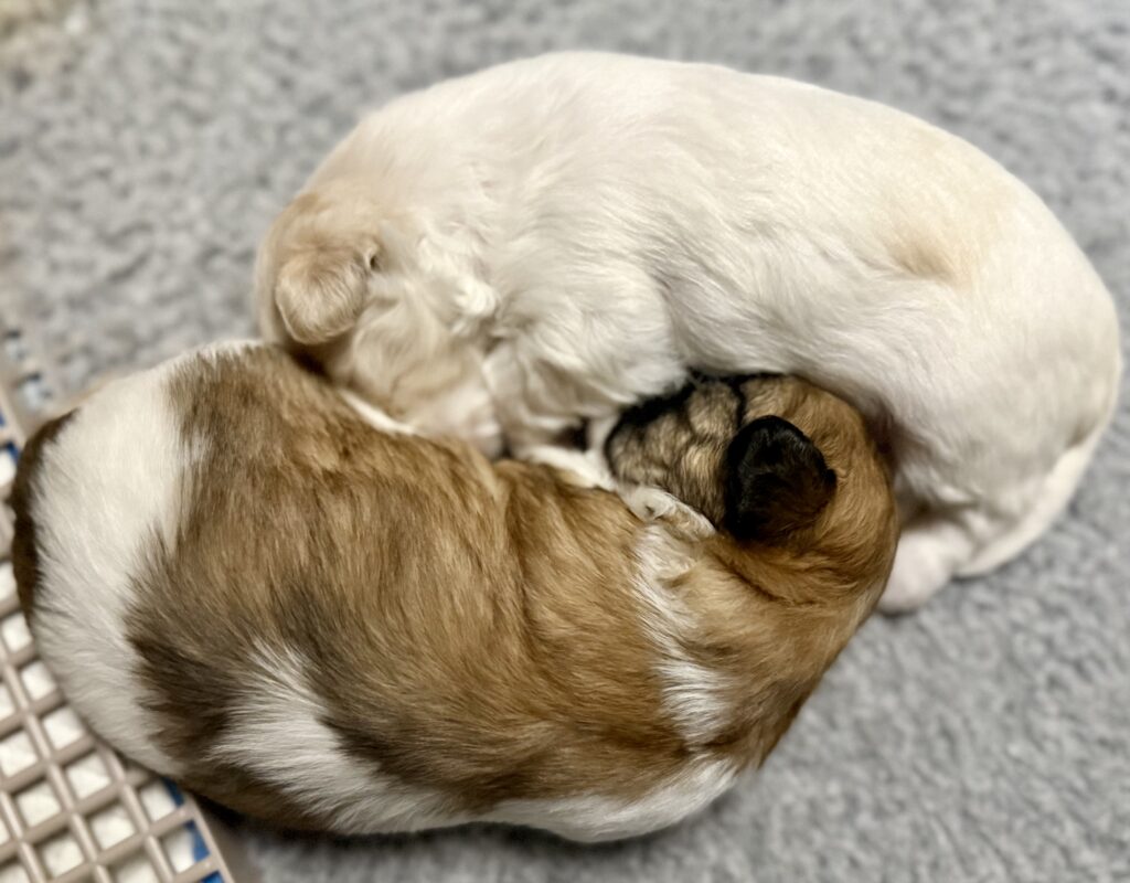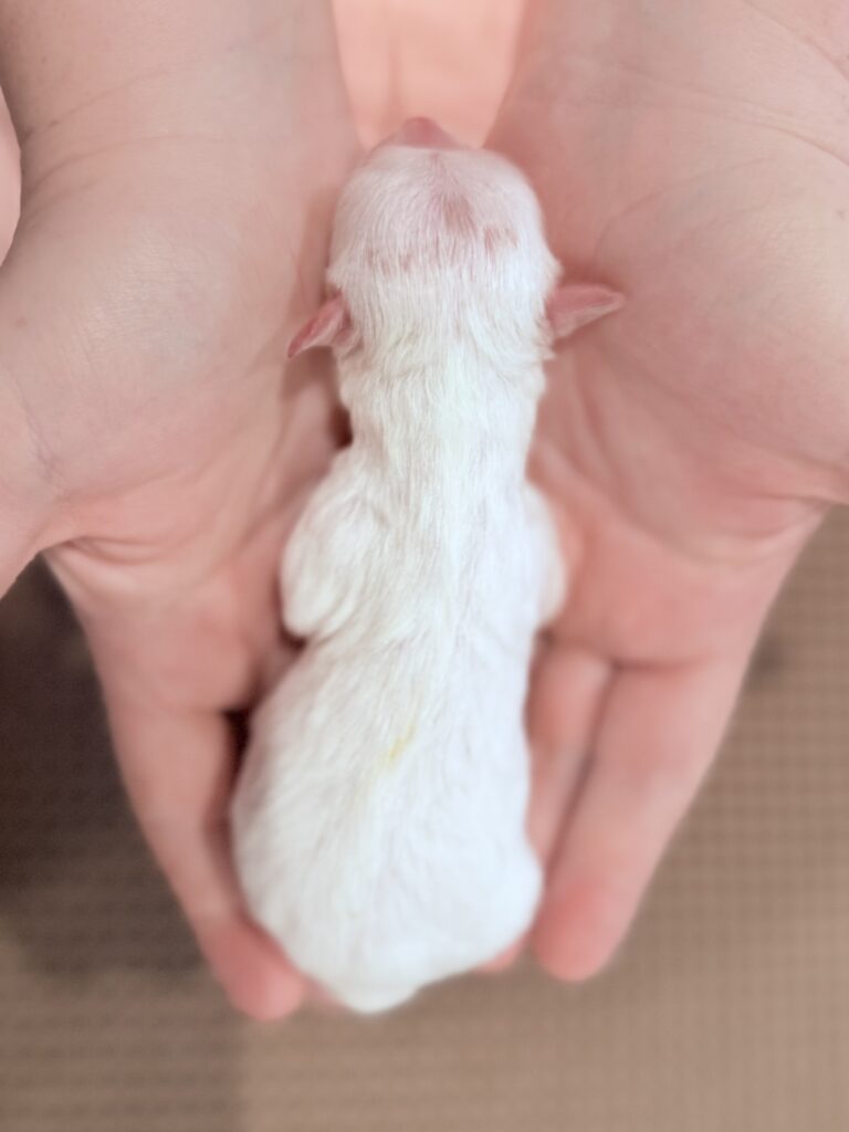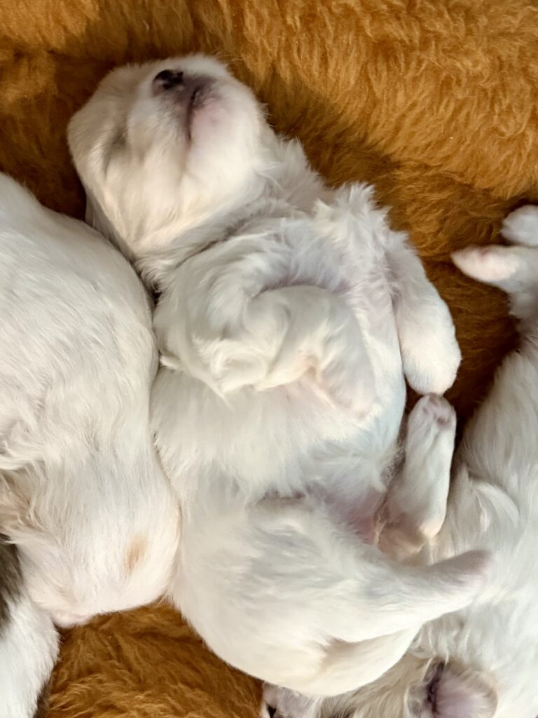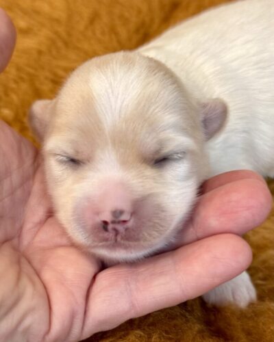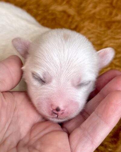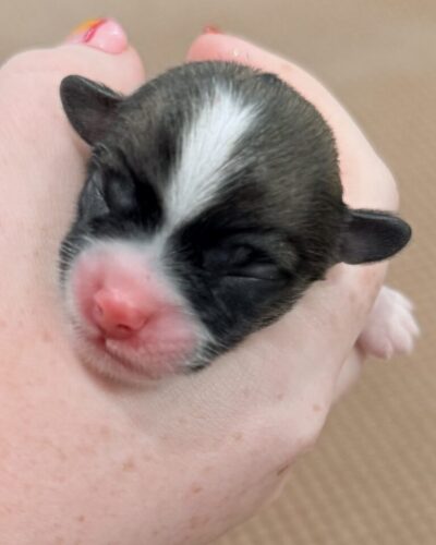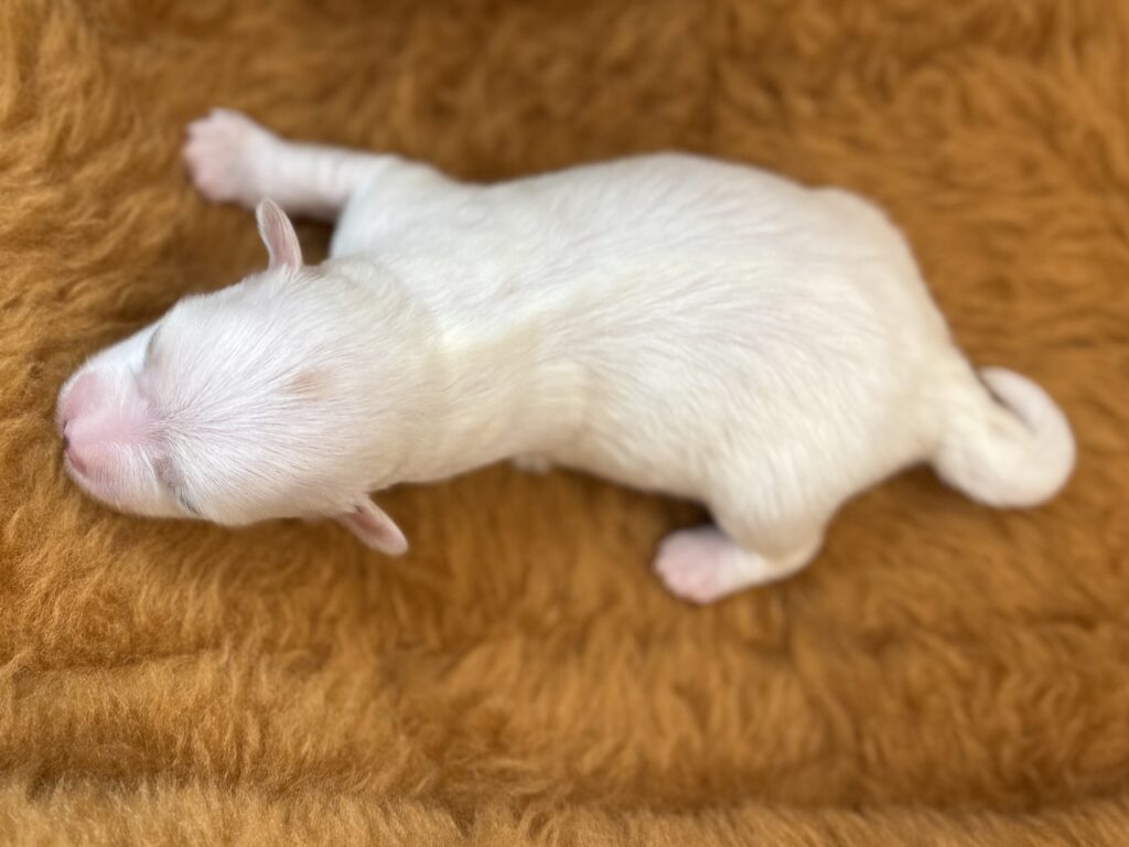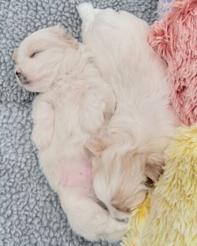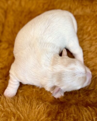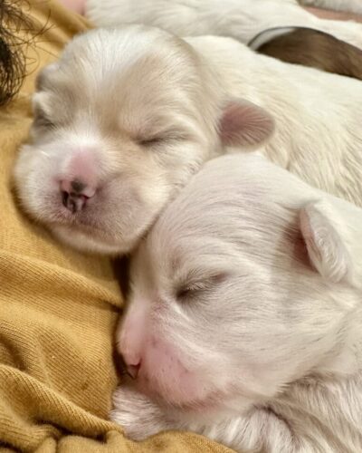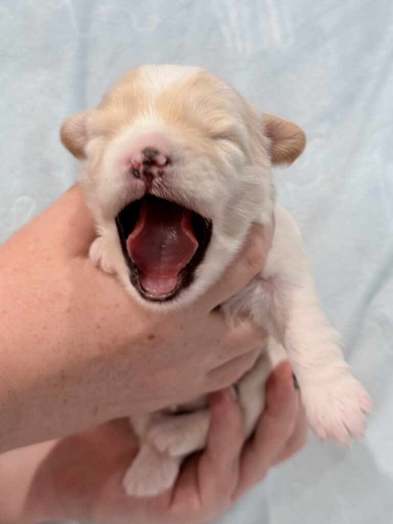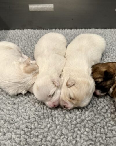 Two weeks old today! Eyes have opened and we guessed wrong…Ruby was the first, followed by Roxanne, Sue and Lola! They are no longer little potatoes whose sole focus was to grow. Getting up on all fours is their big goal now and they can drag themselves/walk all over the whelping box. Next up…who will be the first to open their ears?