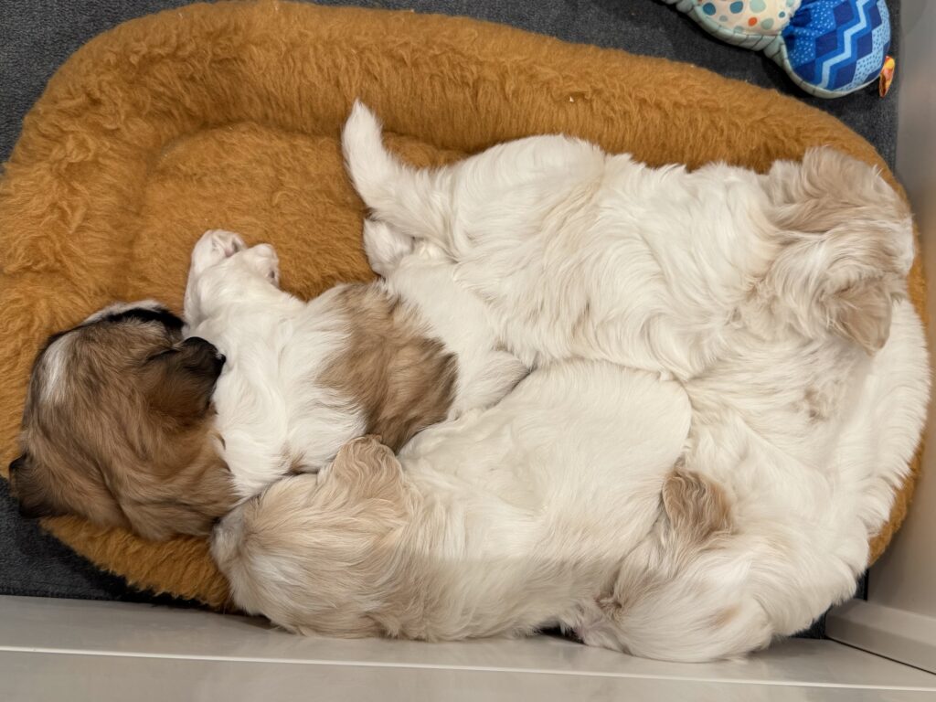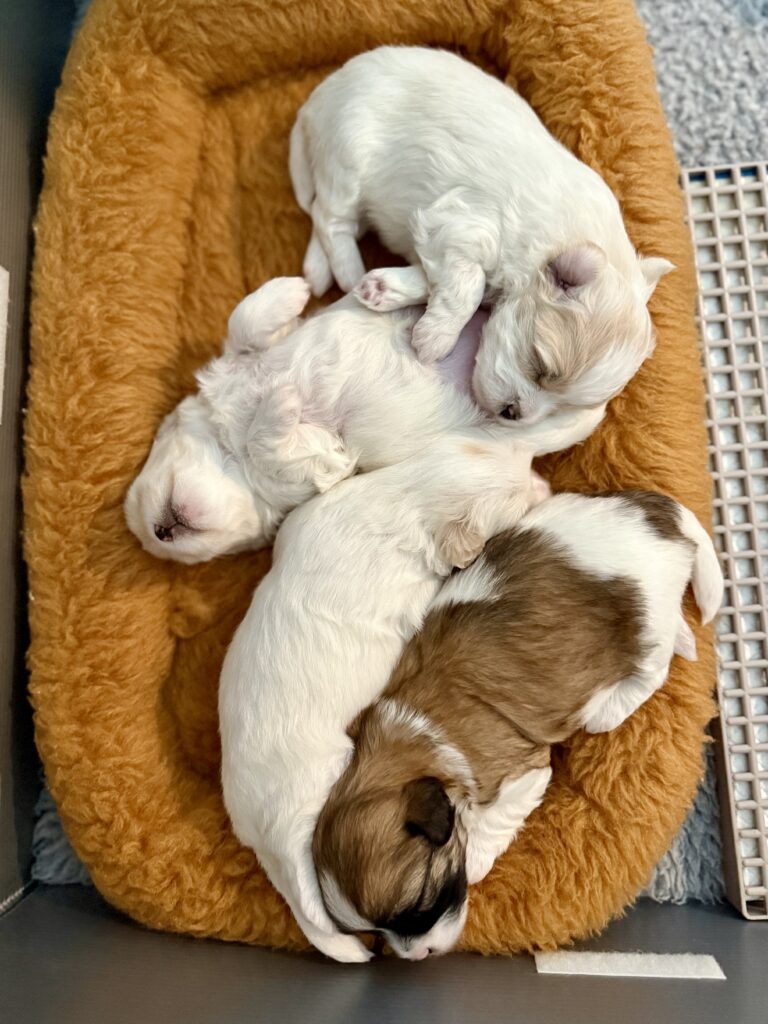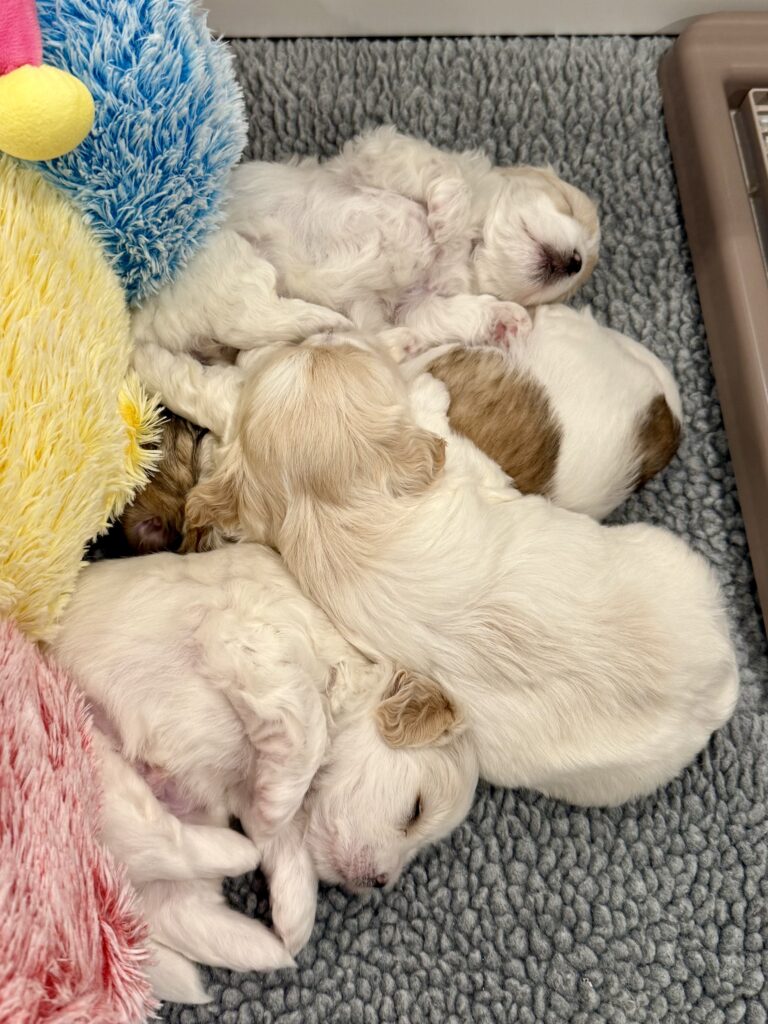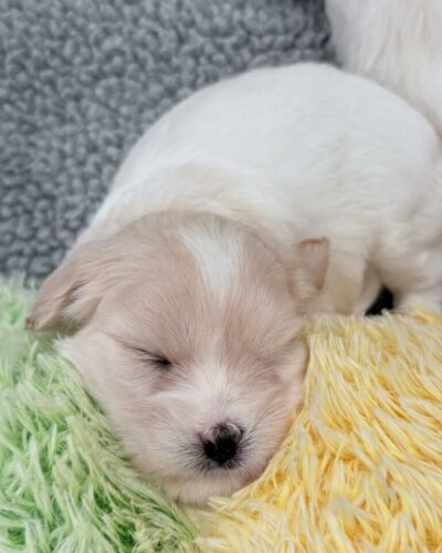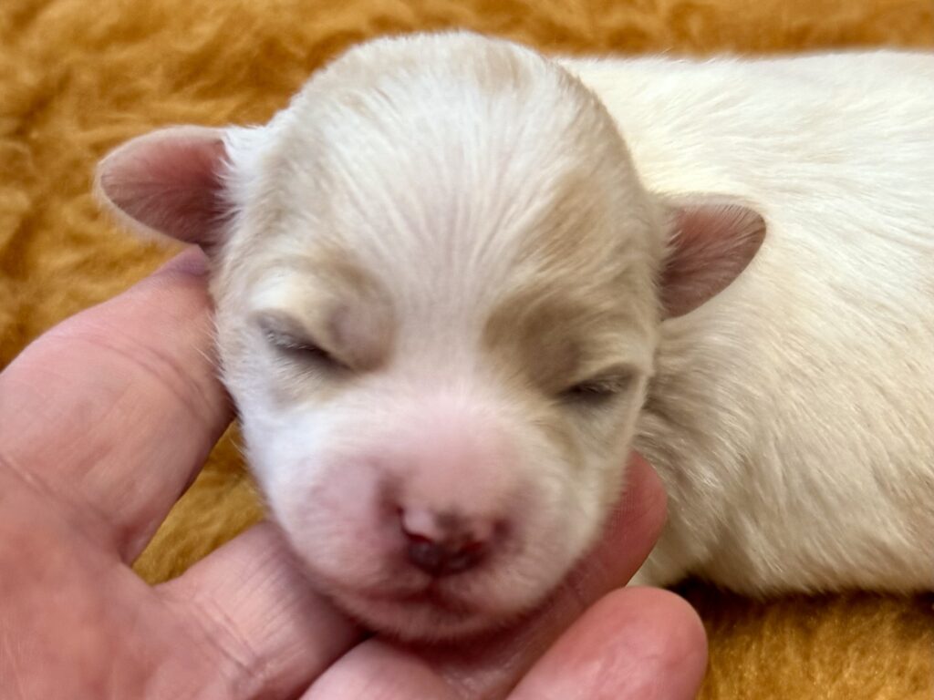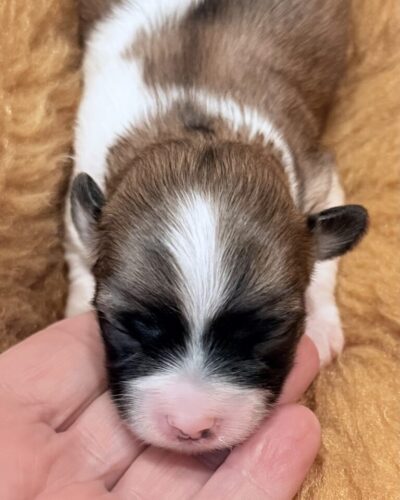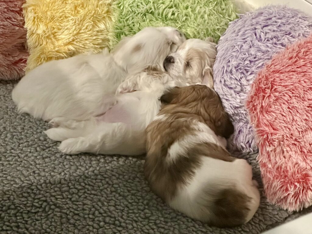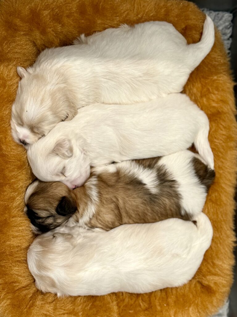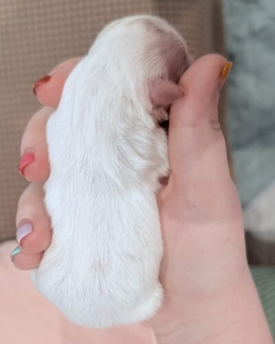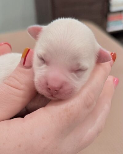 Two weeks old today! Eyes have opened and we guessed wrong…Ruby was the first, followed by Roxanne, Sue and Lola! They are no longer little potatoes whose sole focus was to grow. Getting up on all fours is their big goal now and they can drag themselves/walk all over the whelping box. Next up…who will be the first to open their ears?
