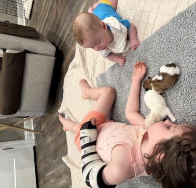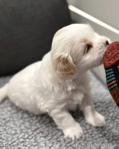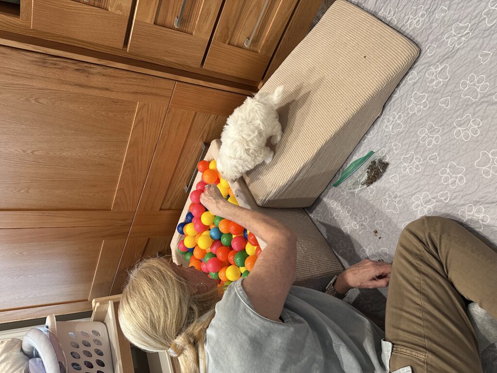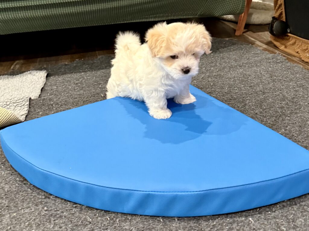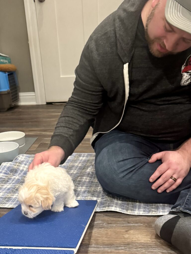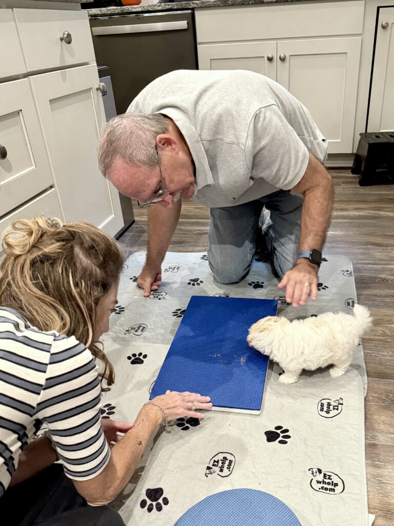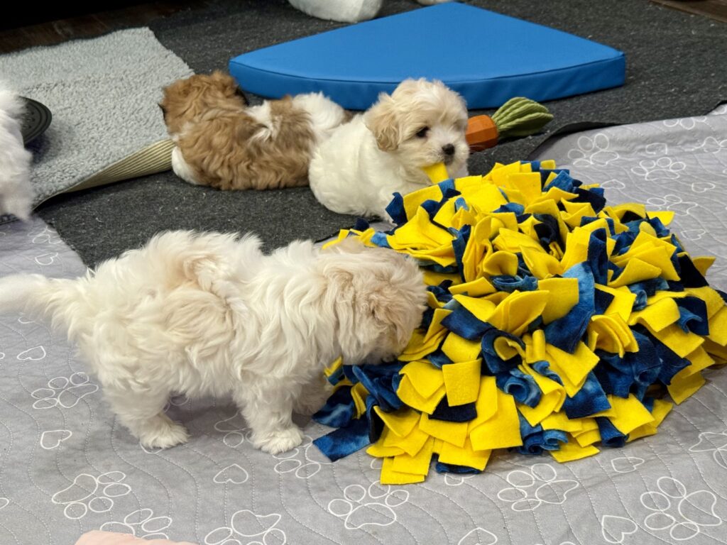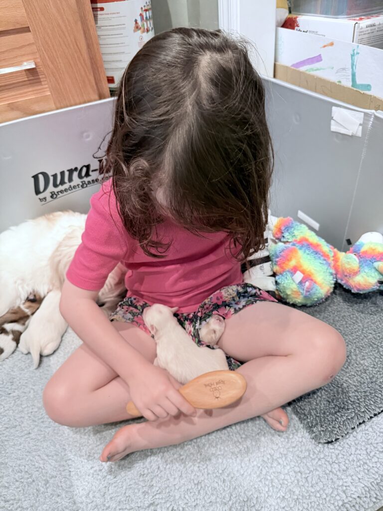 Highlights this week include ears opening, first visitors, adding a nest to their whelping box, adding a potty area to their living quarters, toddling over different surfaces, playing with each other, spending some time away from their mom, one-on-one play sessions with a human outside their area, and toys!
