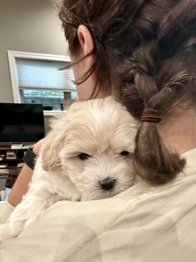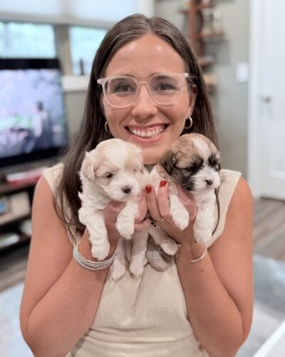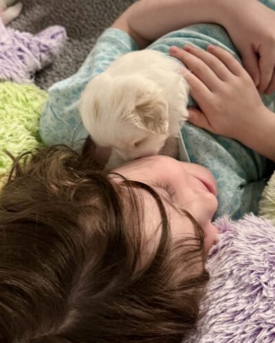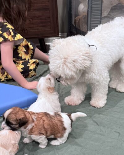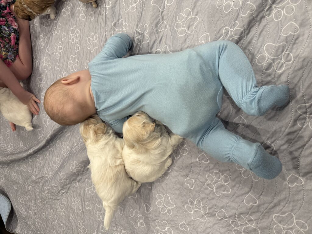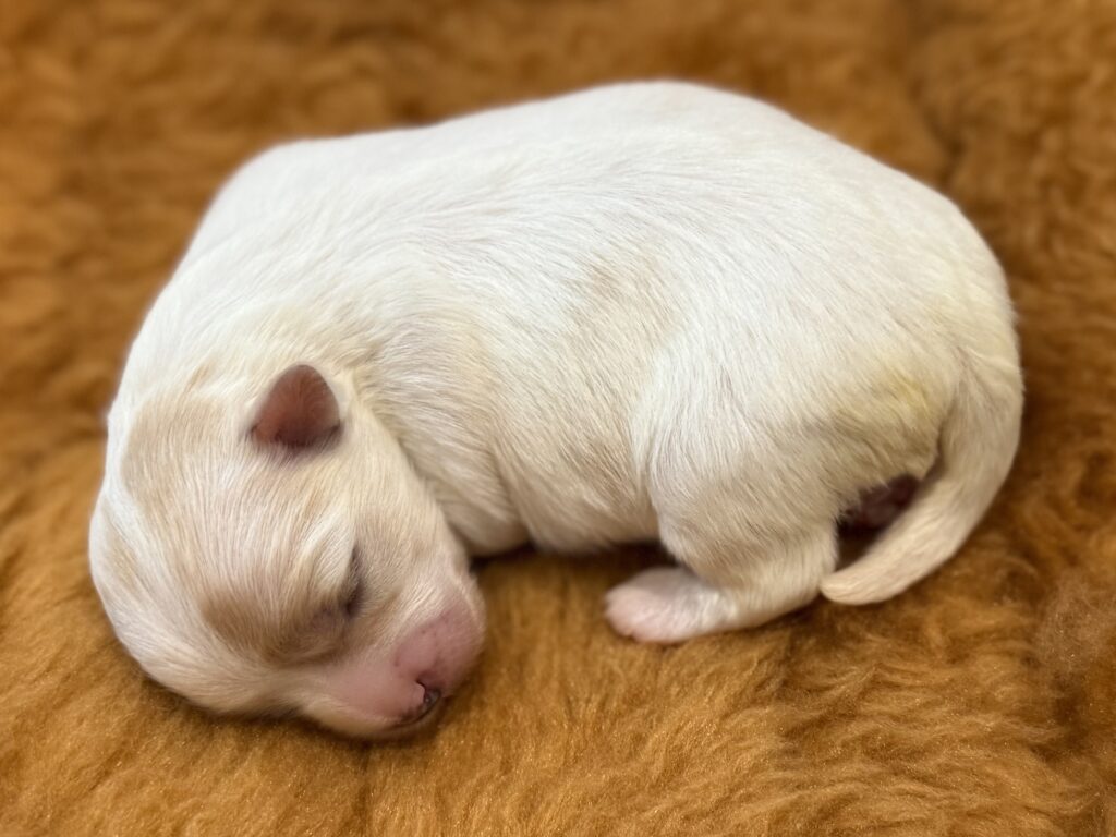 One week old today! Dottie is a great mom…all puppies have doubled their birth weight and we normally don’t see this until close to the 2-week mark. They squirm all over the box, seeking Mom’s warmth and nourishment. Eyes will open soon and we think Sue will be the first!